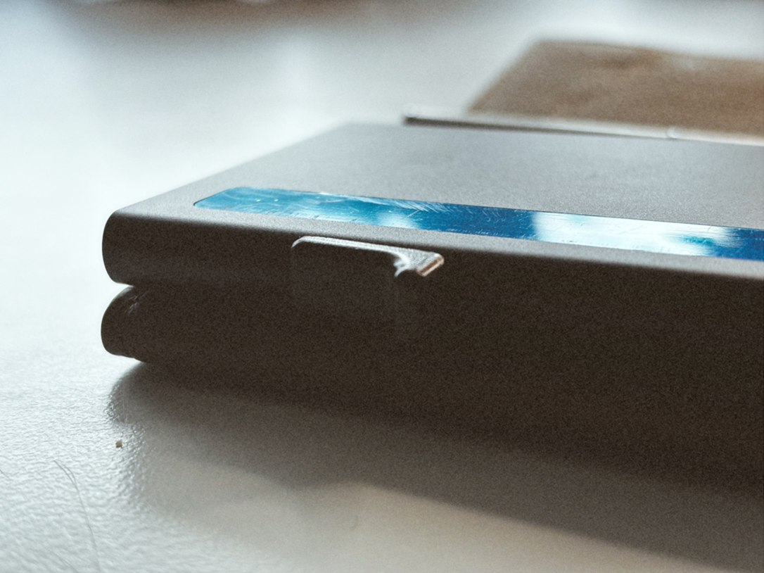 And then, of course, there’s the star of the show — the strong aluminium card case. It can hold up to five cards, and with a simple pull of the trigger, they pop out smoothly and fan open perfectly. Everything is protected against electronic data theft (RFID blocking), which gives peace of mind when travelling. The magnetic closure snaps shut with a satisfying click, adding to that feeling of refinement.