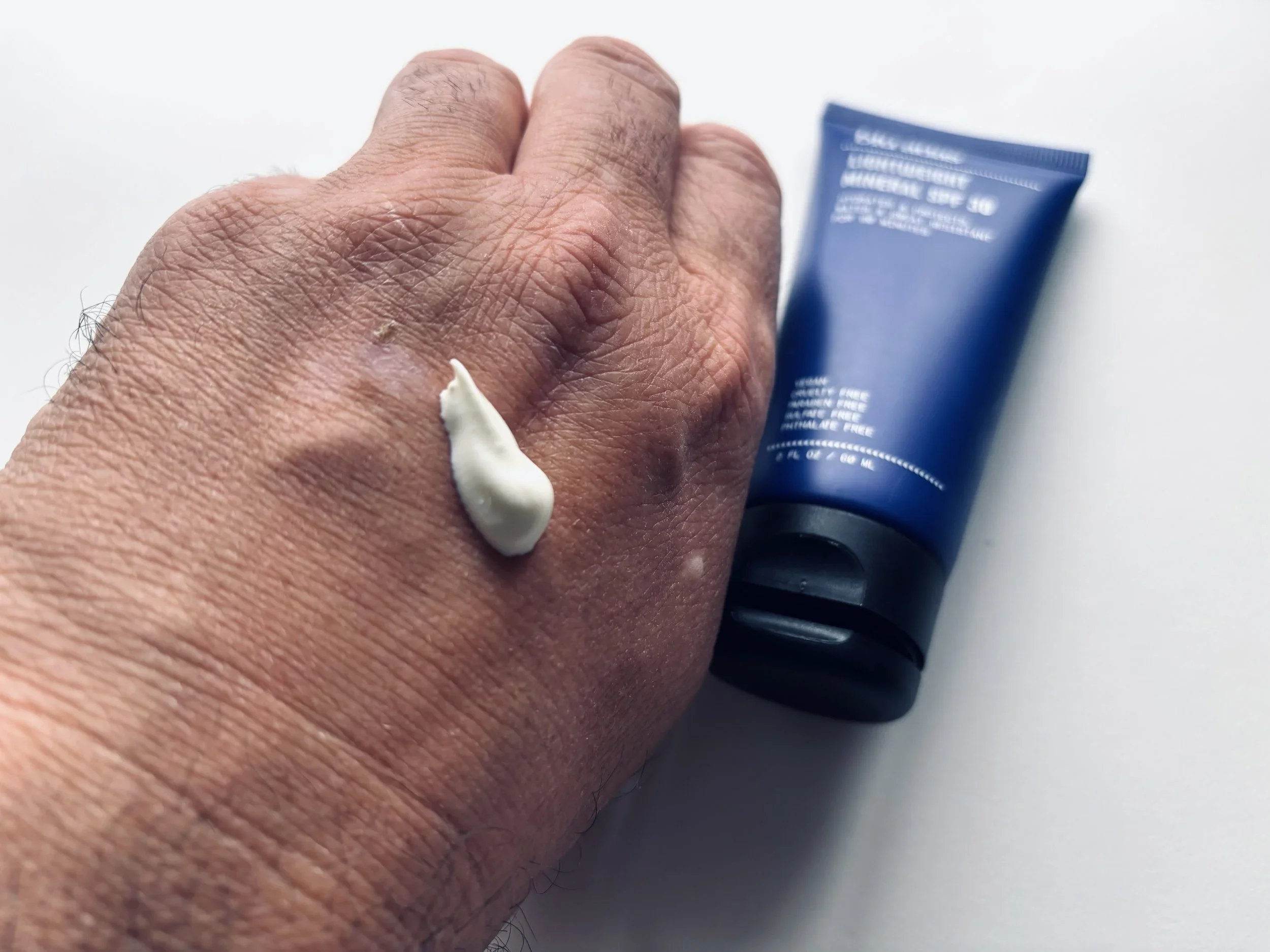 My current recommendation for men who have resisted sunscreen because of texture is the Blu Atlas Lightweight Mineral SPF 30. The active filter is zinc oxide at 15.7% — a mineral ingredient that sits on top of the skin rather than being absorbed, which makes it a better option for sensitive or reactive skin types. In practice, it applies cleanly without the white cast that put men off mineral SPFs for years, and the supporting ingredients — shea butter, aloe, hyaluronic acid, lavender — mean it doubles as a decent morning moisturiser on lighter days.